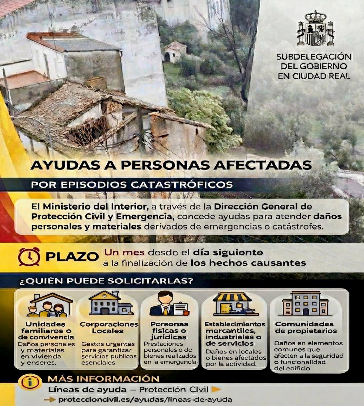 Tras la declaración de Zona Gravemente Afectada por una Emergencia de Protección Civil aprobada por el Consejo de Ministros el 10 de febrero de 2026, que incluye a Castilla-La Mancha entre los territorios afectados por la borrasca Leonardo y que afecta también al municipio de Las Labores, la Subdelegación del Gobierno en Ciudad Real ha trasladado la información relativa a la activación de las ayudas y subvenciones estatales destinadas a paliar los daños personales y materiales ocasionados, así como el procedimiento y plazos establecidos para su tramitación. Entre las modalidades previstas se contemplan ayudas para unidades familiares o de convivencia por daños personales y por daños materiales en vivienda habitual y enseres, cuya cuantía se determina atendiendo, entre otros factores, a la situación económica de las personas afectadas. La información oficial completa, incluyendo requisitos, documentación necesaria, procedimiento de concesión y modelos de solicitud, está disponible en el portal de “Líneas de ayuda” de la Dirección General de Protección Civil y Emergencias, accesible a través de la página web https://www.proteccioncivil.es/ayudas/lineas-de-ayuda El plazo máximo para solicitar las ayudas es el día 03 de Marzo.